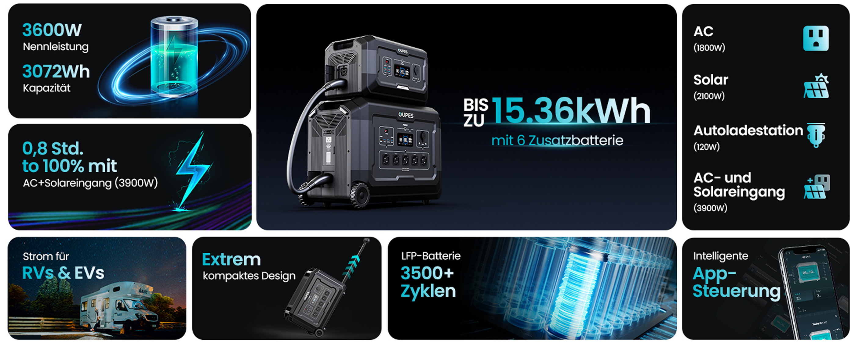 • Fully recharge in 1 hour with 3,900W Max. Input (AC+solar)